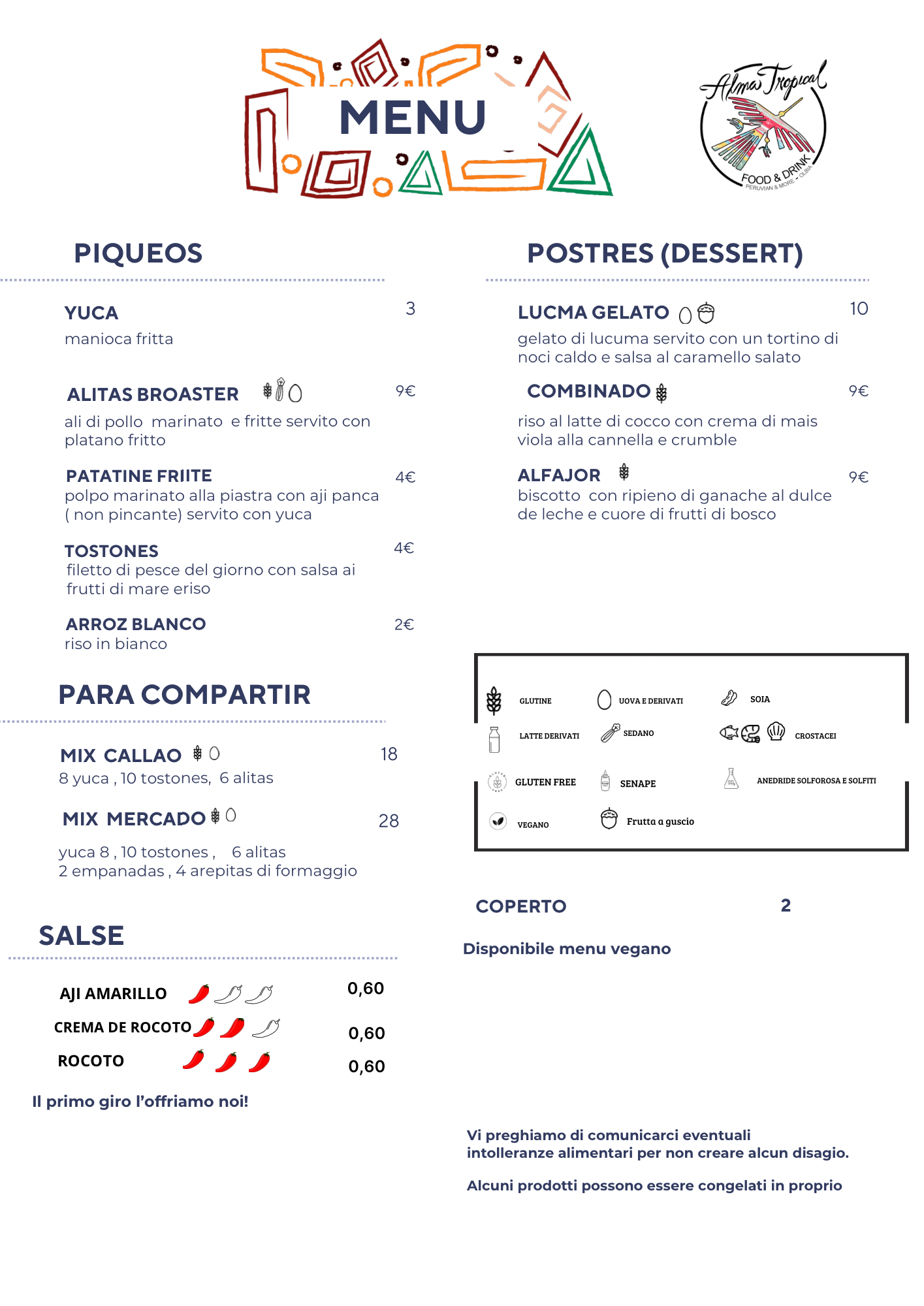 Ti invitiamo a scoprire i nostri piatti e a lasciarti conquistare dal nostro ambiente accogliente, perfetto per una cena in famiglia, una serata tra amici o una pausa golosa in compagnia. Benvenuti da Alma Tropical, dove la cucina peruviana è un'esperienza da vivere e assaporare.