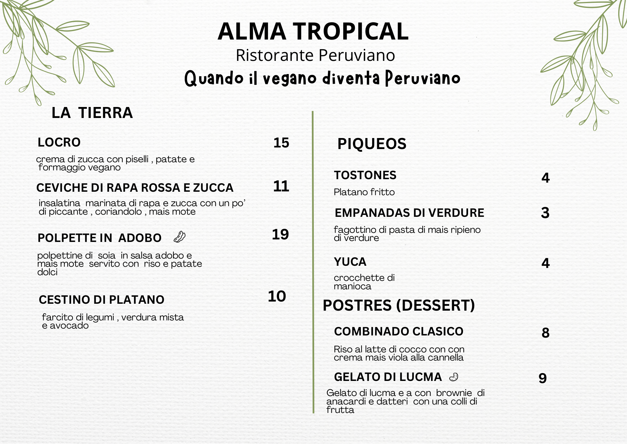 Ogni ingrediente viene selezionato con cura per offrirti un'esperienza autentica e indimenticabile. Da Alma Tropical, ogni boccone è un'esplosione di freschezza, passione e tradizione, che ti porterà direttamente nel cuore del Perù. Se cerchi una cucina genuina, ricca di sapori esotici e piatti che raccontano una storia di terre lontane, Alma Tropical è il posto che fa per te.